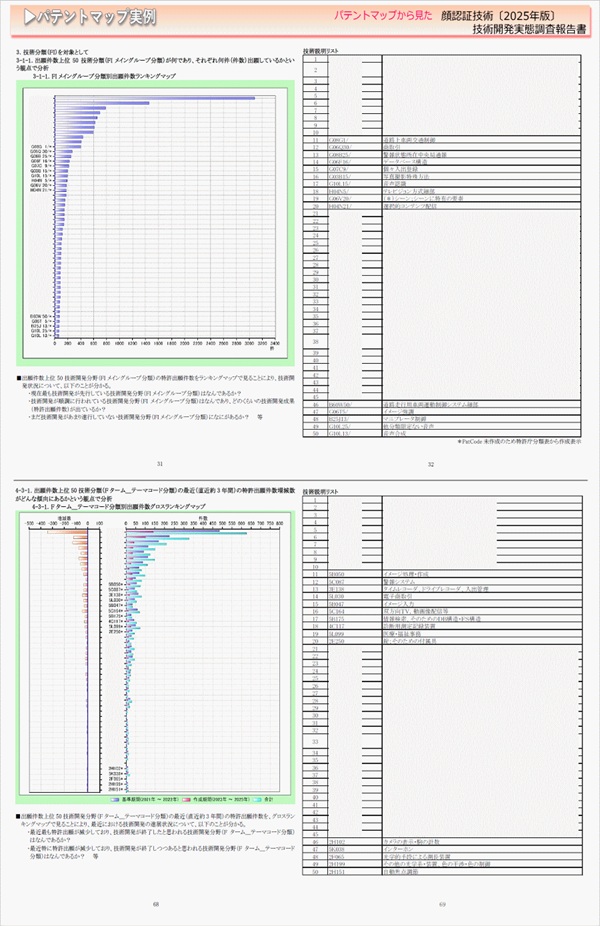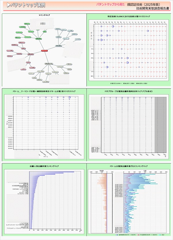 「顔認証技術」に関する出願件数、出願人(共同出願人)、発明者、特許分類などに対し、ランキング、時系列推移、技術分布図など様々な観点から分析したパテントマップを作成し、技術開発の実態を把握し今後の開発の指針決定に役立てようとするものである。