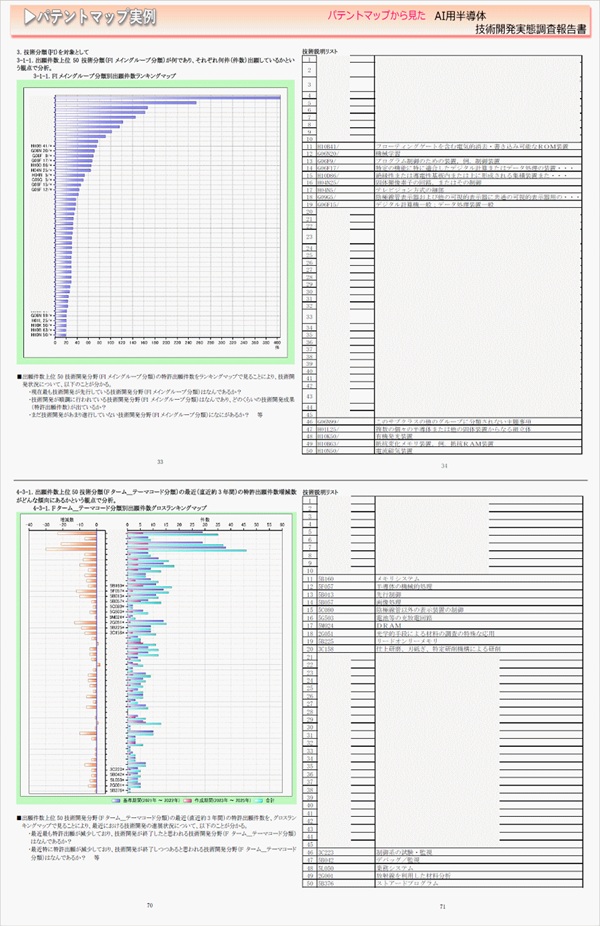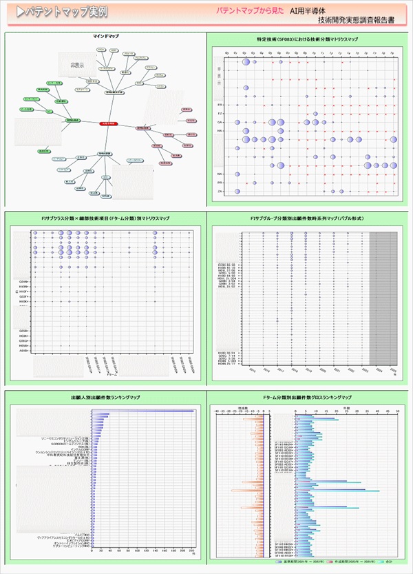 「AI用半導体」に関する出願件数、出願人(共同出願人)、発明者、特許分類などに対し、ランキング、時系列推移、技術分布図など様々な観点から分析したパテントマップを作成し、技術開発の実態を把握し今後の開発の指針決定に役立てようとするものである。