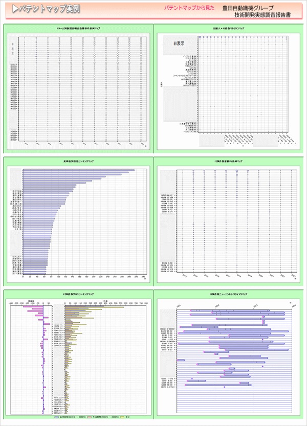 「豊田自動織機グループ」に関する出願件数、出願人(共同出願人)、発明者、特許分類などに対し、ランキング、時系列推移、技術分布図など様々な観点から分析したパテントマップを作成し、技術開発の実態を把握し今後の開発の指針決定に役立てようとするものである。