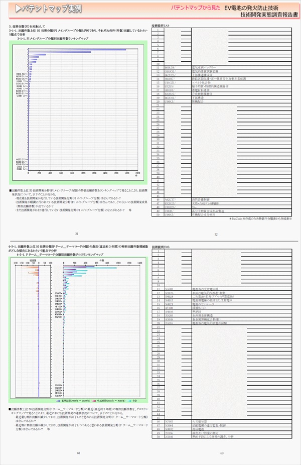 「EV電池の発火防止技術」に関する出願件数、出願人(共同出願人)特許分類などに対し、ランキング、時系列推移、技術分布図など様々な観点から分析したパテントマップを作成し、技術開発の実態を把握し今後の開発の指針決定に役立てようとするものである。