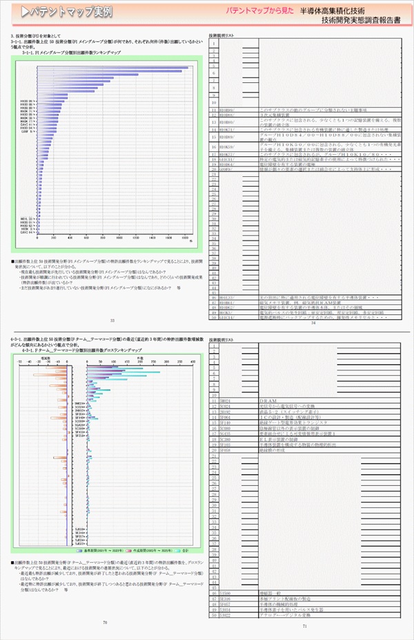 「半導体高集積化技術」に関する出願件数、出願人(共同出願人)特許分類などに対し、ランキング、時系列推移、技術分布図など様々な観点から分析したパテントマップを作成し、技術開発の実態を把握し今後の開発の指針決定に役立てようとするものである。