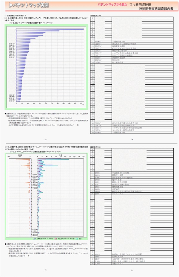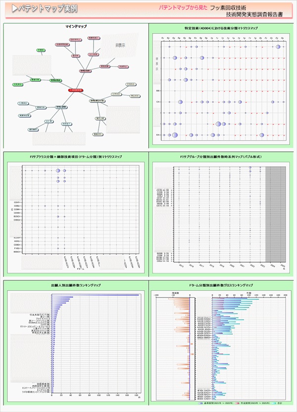 「フッ素回収技術」に関する出願件数、出願人(共同出願人)特許分類などに対し、ランキング、時系列推移、技術分布図など様々な観点から分析したパテントマップを作成し、技術開発の実態を把握し今後の開発の指針決定に役立てようとするものである。