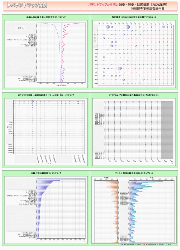 「消臭・脱臭・除菌機器」に関する出願件数、出願人(共同出願人)、特許分類などに対し、ランキング、時系列推移、技術分布図など様々な観点から分析したパテントマップを作成し、技術開発の実態を把握し今後の開発の指針決定に役立てようとするものである。
