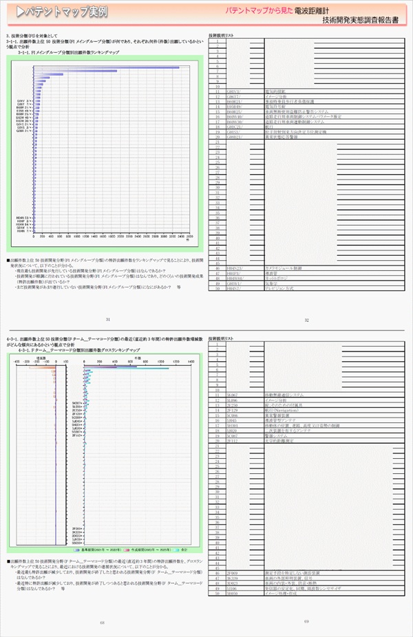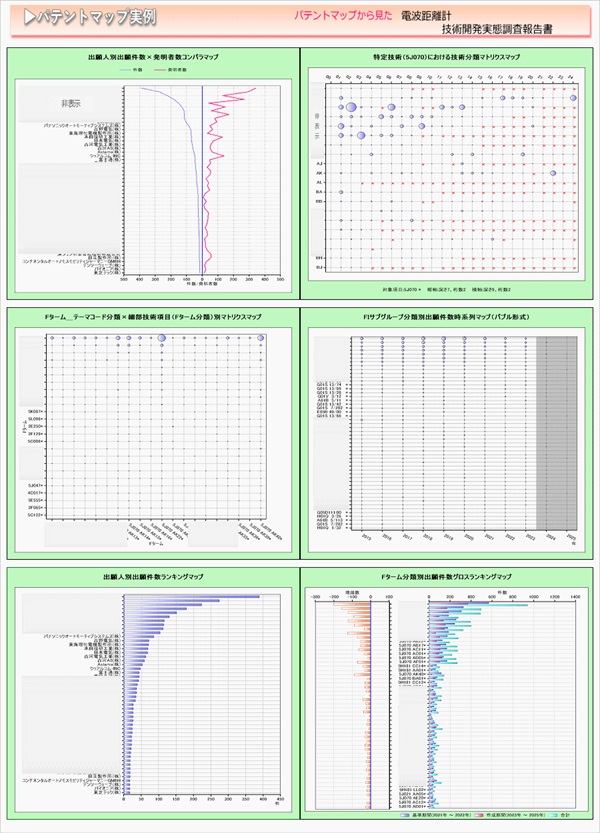 「電波距離計」に関する出願件数、出願人(共同出願人)、特許分類などに対し、ランキング、時系列推移、技術分布図など様々な観点から分析したパテントマップを作成し、技術開発の実態を把握し今後の開発の指針決定に役立てようとするものである。
