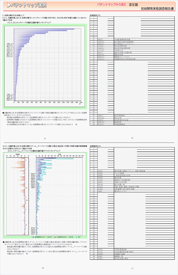 「変圧器」に関する出願件数、出願人(共同出願人)、特許分類などに対し、ランキング、時系列推移、技術分布図など様々な観点から分析したパテントマップを作成し、技術開発の実態を把握し今後の開発の指針決定に役立てようとするものである。