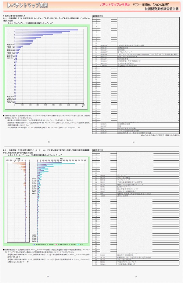 「パワー半導体」に関する出願件数、出願人(共同出願人)、特許分類などに対し、ランキング、時系列推移、技術分布図など様々な観点から分析したパテントマップを作成し、技術開発の実態を把握し今後の開発の指針決定に役立てようとするものである。